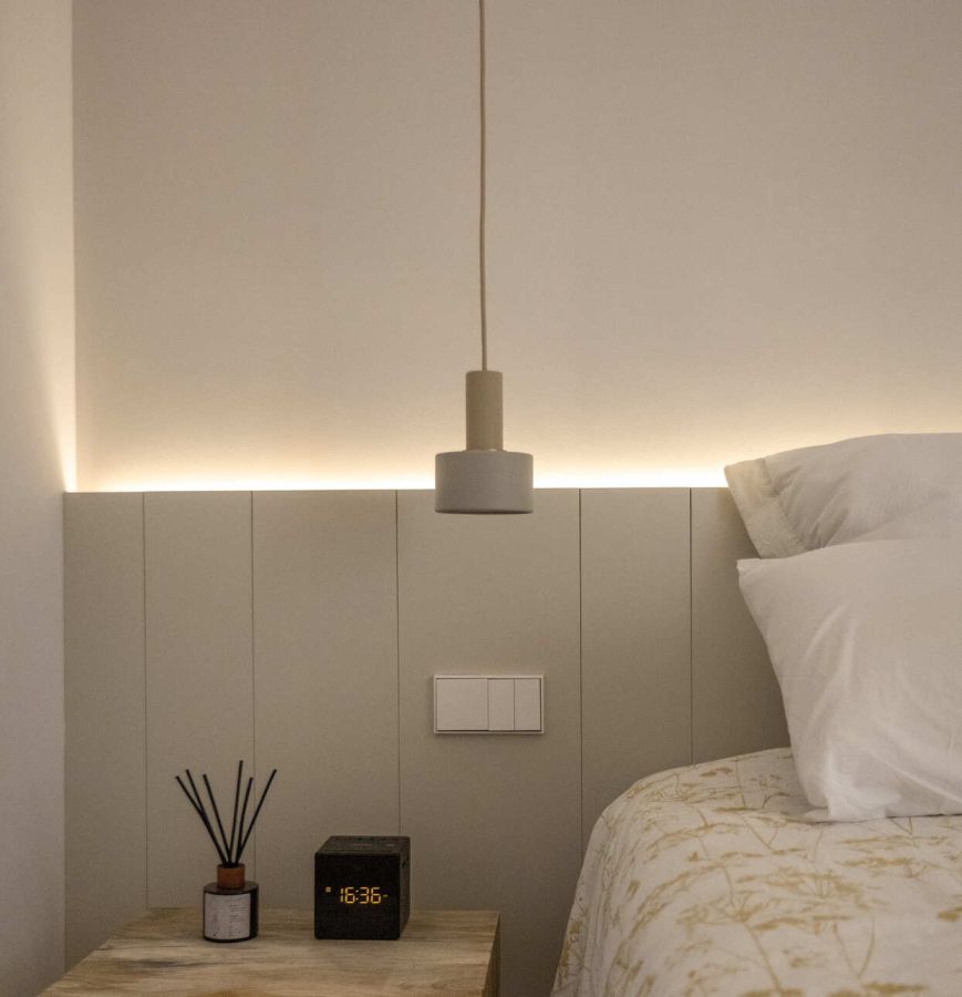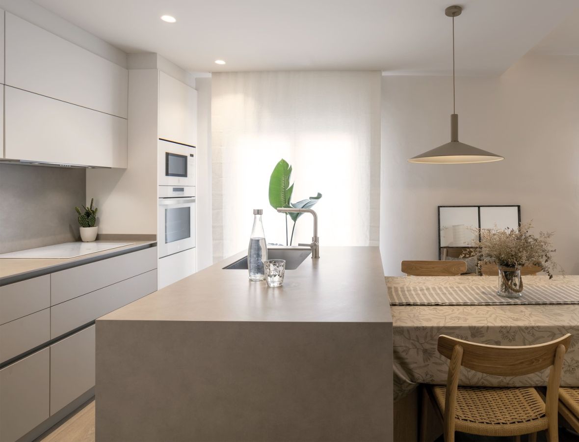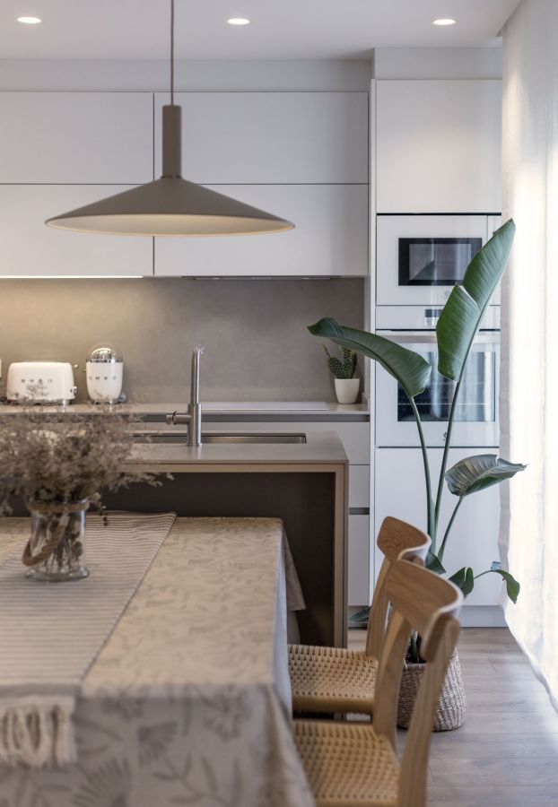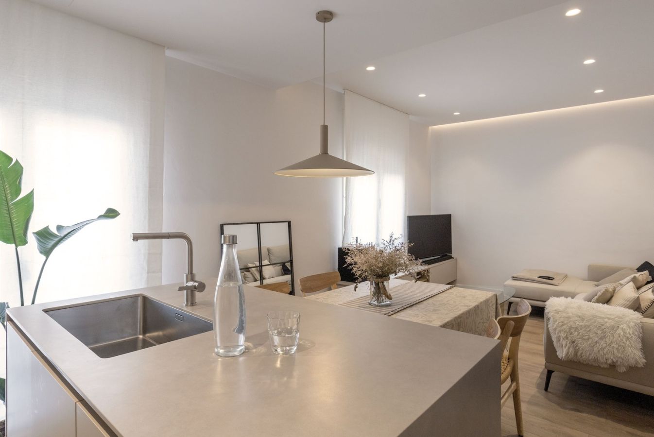 La zona de dia, oberta i lluminosa, flueix amb naturalitat entre la sala d’estar, el menjador i la cuina, mentre que la zona de nit, amb materials naturals i tons neutres, crea un ambient càlid i reposat. Una reforma pensada perquè, enmig del ritme de la ciutat, sempre hi hagi un lloc per aturar-se, respirar i sentirse a casa.